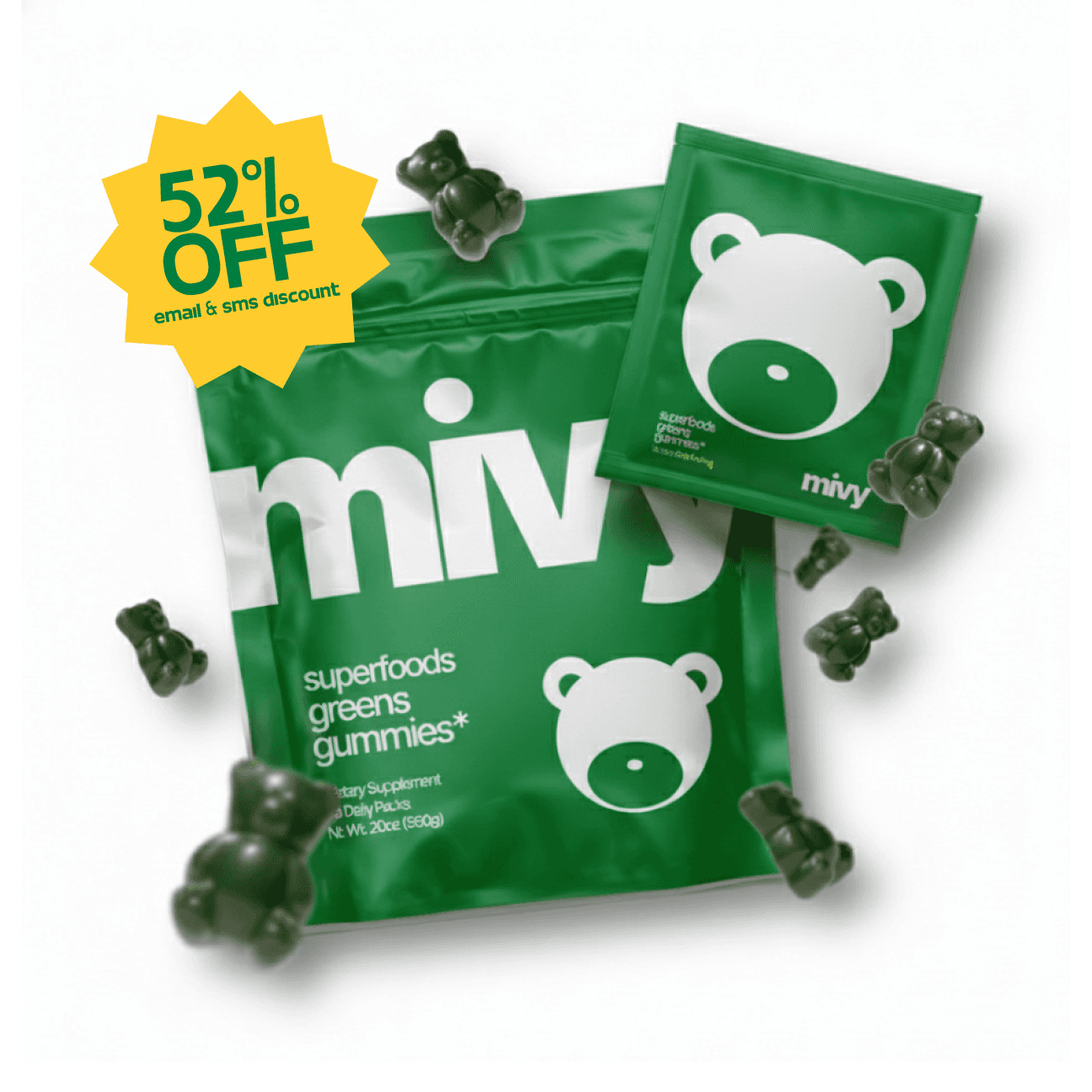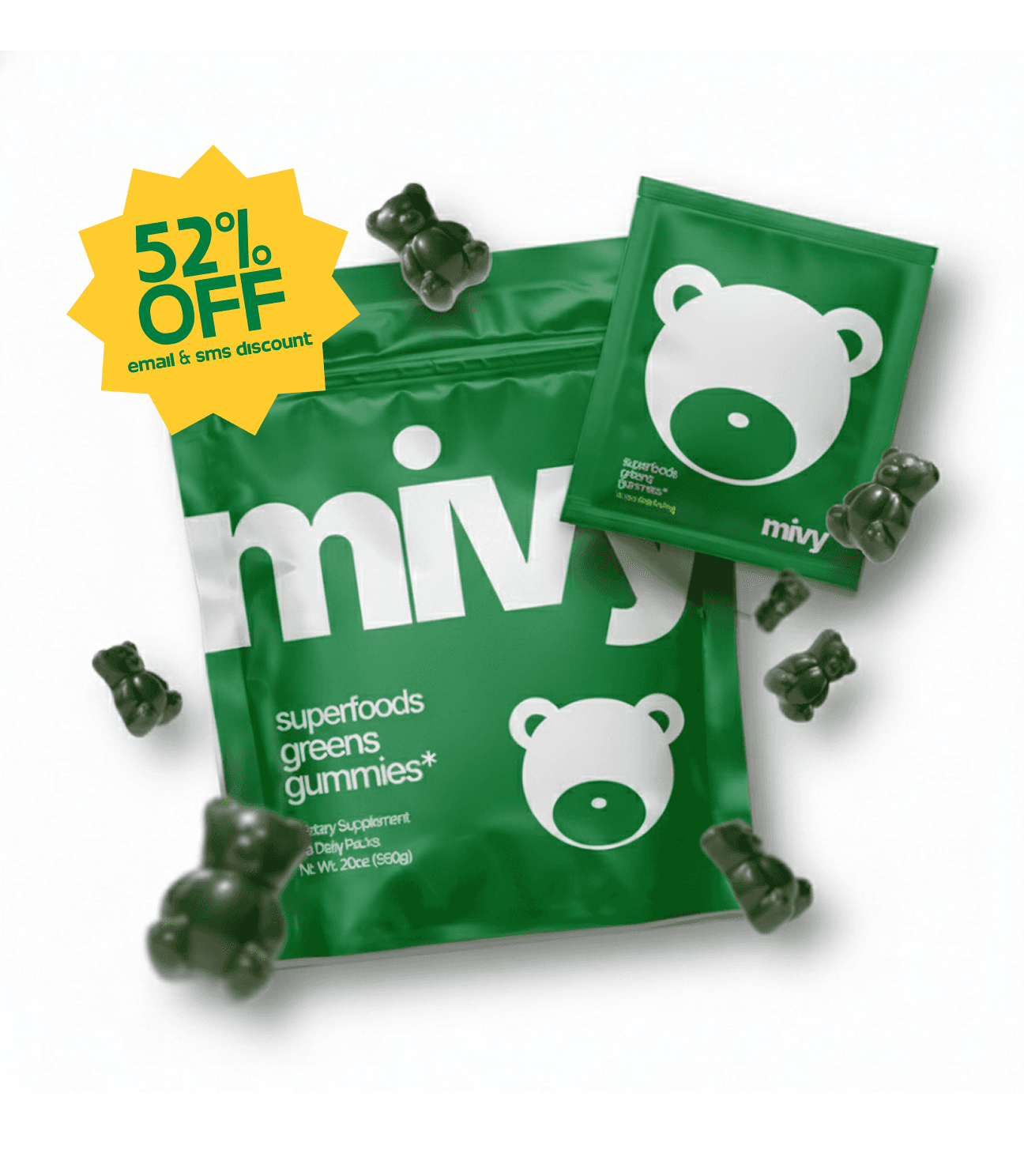 Containing 28 Pocket Packs & 8 Gummies Per Serve, Mivy Gummies are chewy, vegan treats packed with 60 organic superfoods for gut health, immunity, recovery, and mental focus.